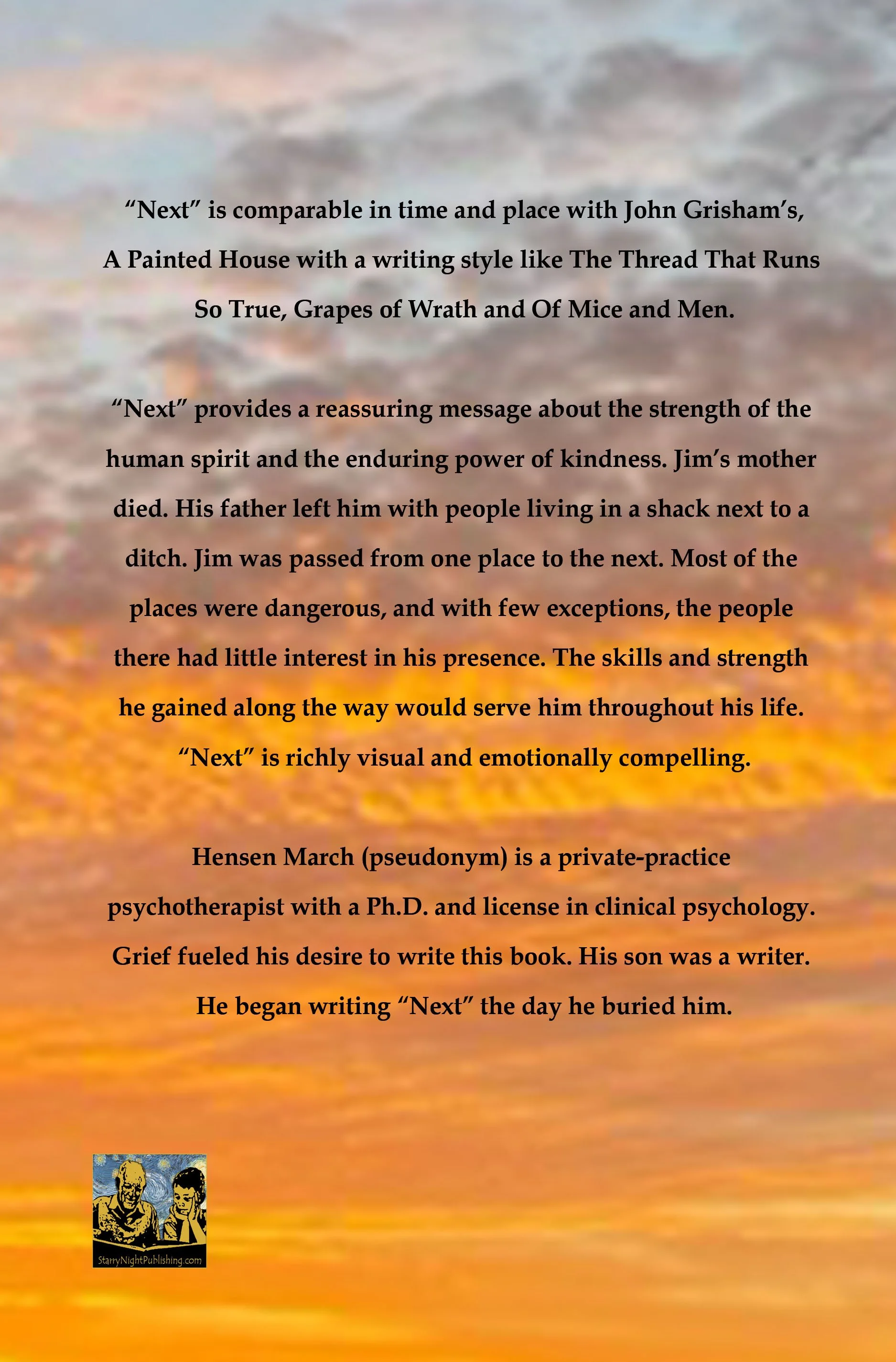 Based on actual events, this story takes you on a rollercoaster ride as the young protagonist draws strength from acts of kindness toward him and memories of his mother’s love—strength that sustains him through heartbreaking times of cruelty and indifference. This boy’s journey from one uncertainty to the next is like a handbook for survival and triumph in the face of grim adversity. You can’t help but come away from the book with a keen reminder of the way warm memories can offer respite from stress and fear in the moment. The story also gives compelling testament to the powers of planning and perseverance in the face of danger and neglect. It’s an inspiring story that is all the more memorable because it is exceptionally well written. Hensen March creates rich, vivid images interspersed with humor and intriguing perspectives on life that continue to come to mind long after finishing the book. The author’s skill in weaving the protagonist’s thoughts and “internal monologue” into the telling of the story gives such insight to this remarkable character. I highly recommend “Next”.